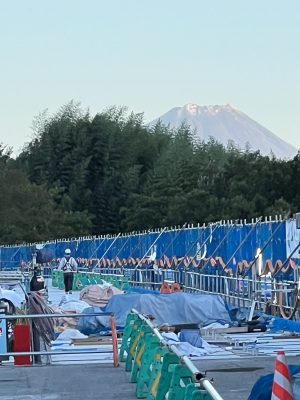 現場からチラリと見える富士山の山頂に雪が見えました!